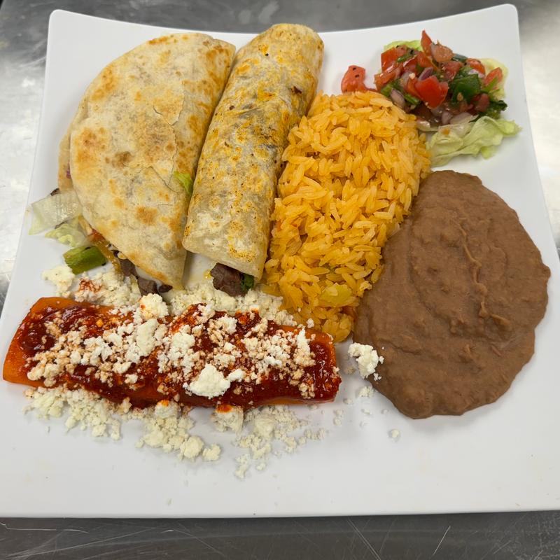 Tex-Mex chicken enchilada, 2 street beef fajita tacos, rice, refried beans, and chile con queso.
