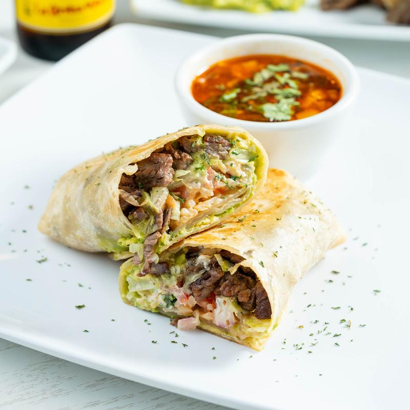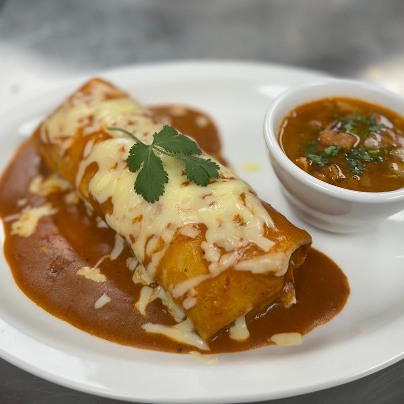 Your choice of fajita beef or chicken stuffed with guacamole, cheese, pico de gallo, and rice. Topped with red gravy sauce and white cheese. Served with charro beans.