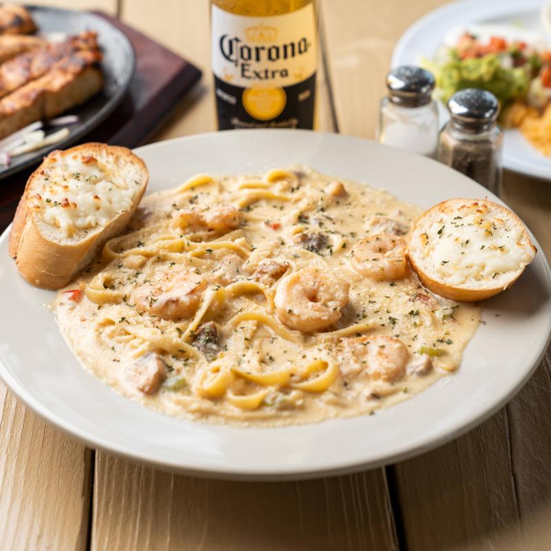 Prepared in a creamy cheesy sauce with chicken and shrimp. Garnished with cilantro parmesan cheese and tomato. Accompanied with two garlic toast.