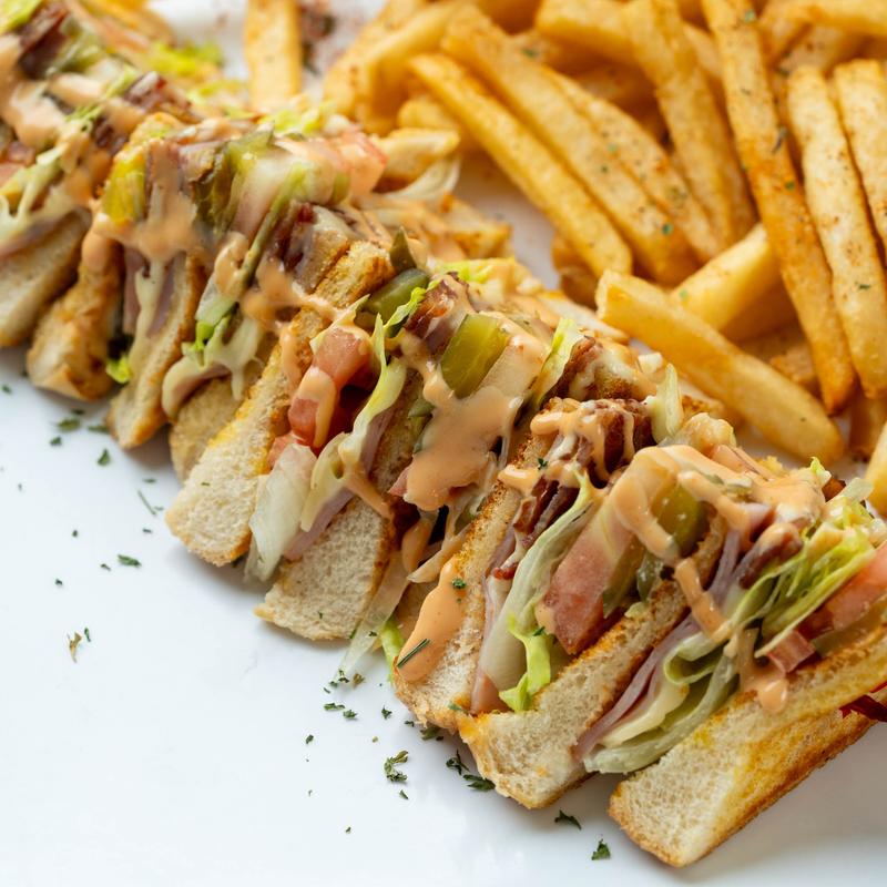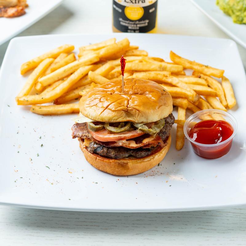 Prepared with bacon, ham, cheese, lettuce, tomato, pickles, our secret homemade dressing and jalapenos. Served with fries.