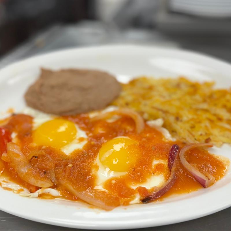 Diced corn tortillas mixed with eggs and your choice of green or red salsa. Topped with cheese and onions. Served with refried beans.