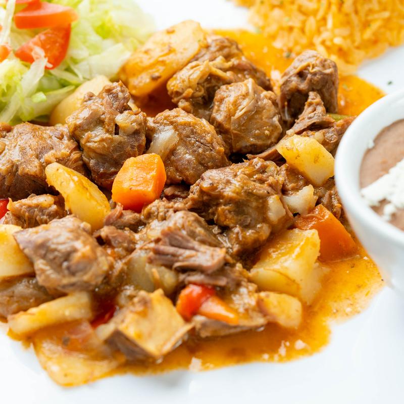 Delicious carne guisada. Served with rice, refried beans and salad.