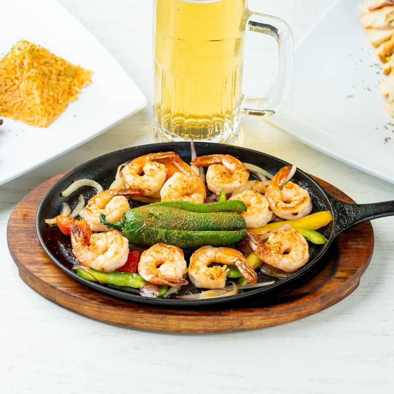 Grilled shrimp is served on a sizzling platter. Accompanied by guacamole, pico de gallo, rice and charro beans.