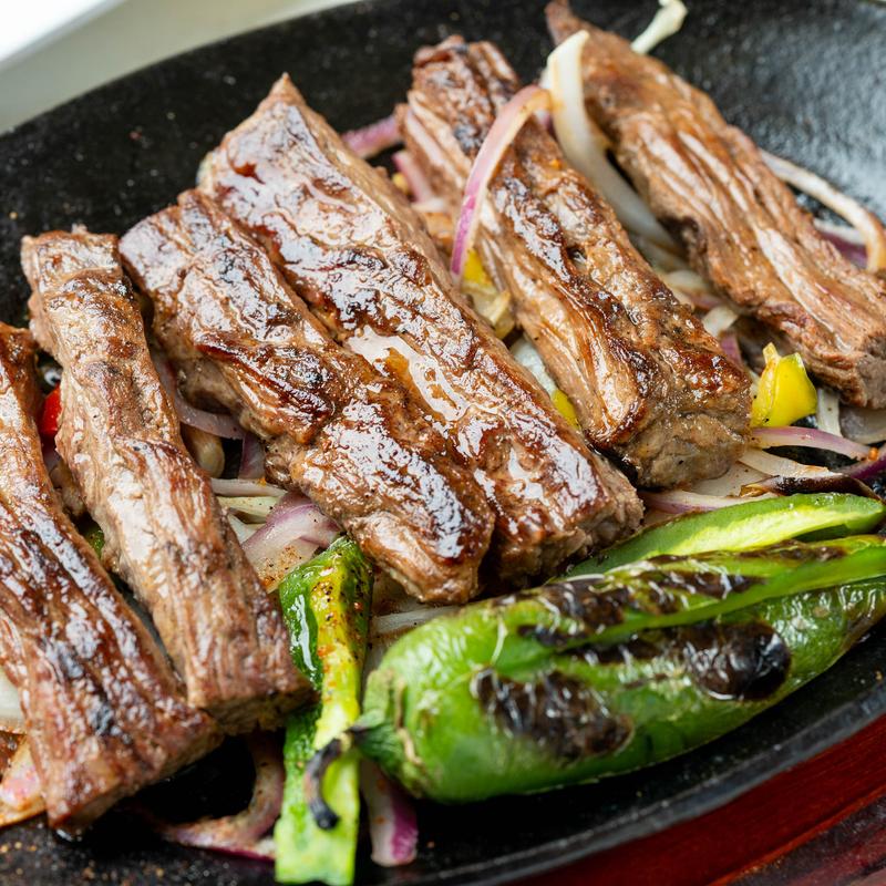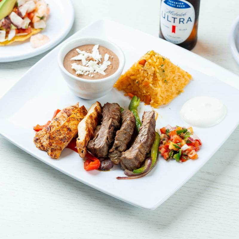 7 oz of fajita beef, chicken, or mixed. Served with grilled onions, pico de gallo, sour cream, rice, and refried beans.