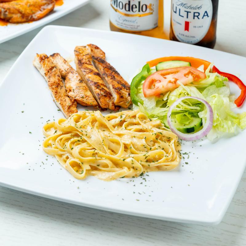 Our delicious pasta in a creamy sauce topped with parmesan cheese. Served with grilled chicken and salad.