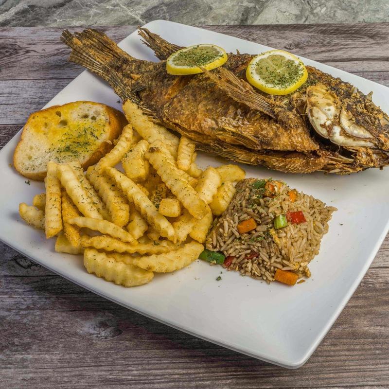Served with garlic herb vegetables – Tender broccoli, cauliflower & carrots steamed then sautéed with garlic and spices and golden fried rice with egg & spring onions