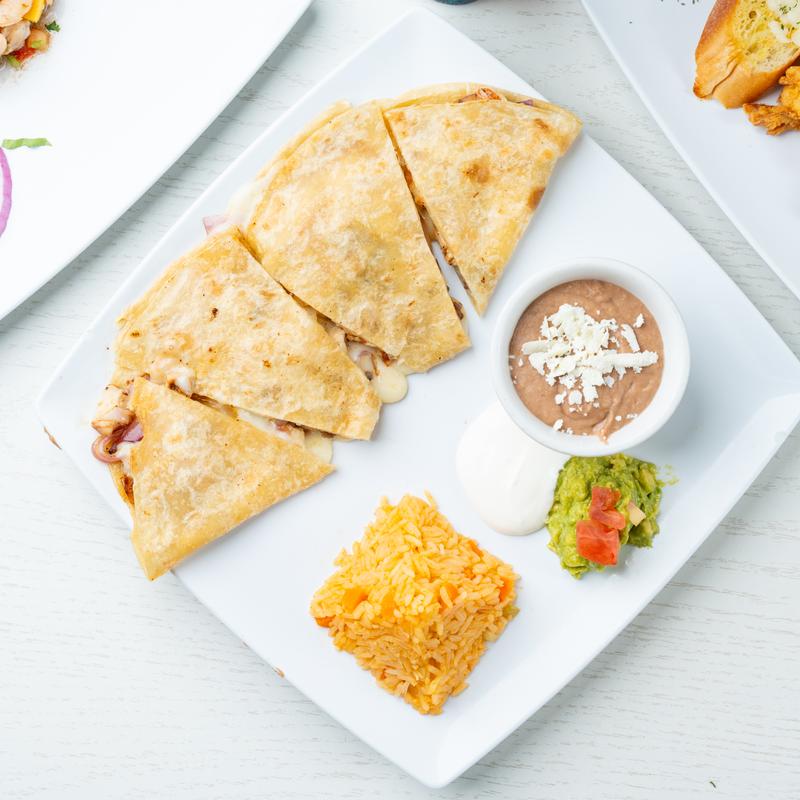 Beef or chicken fajita quesadilla prepared with onions, green and red bellpeppers, Accompanied with refried beans, rice, guacamole and sour cream.